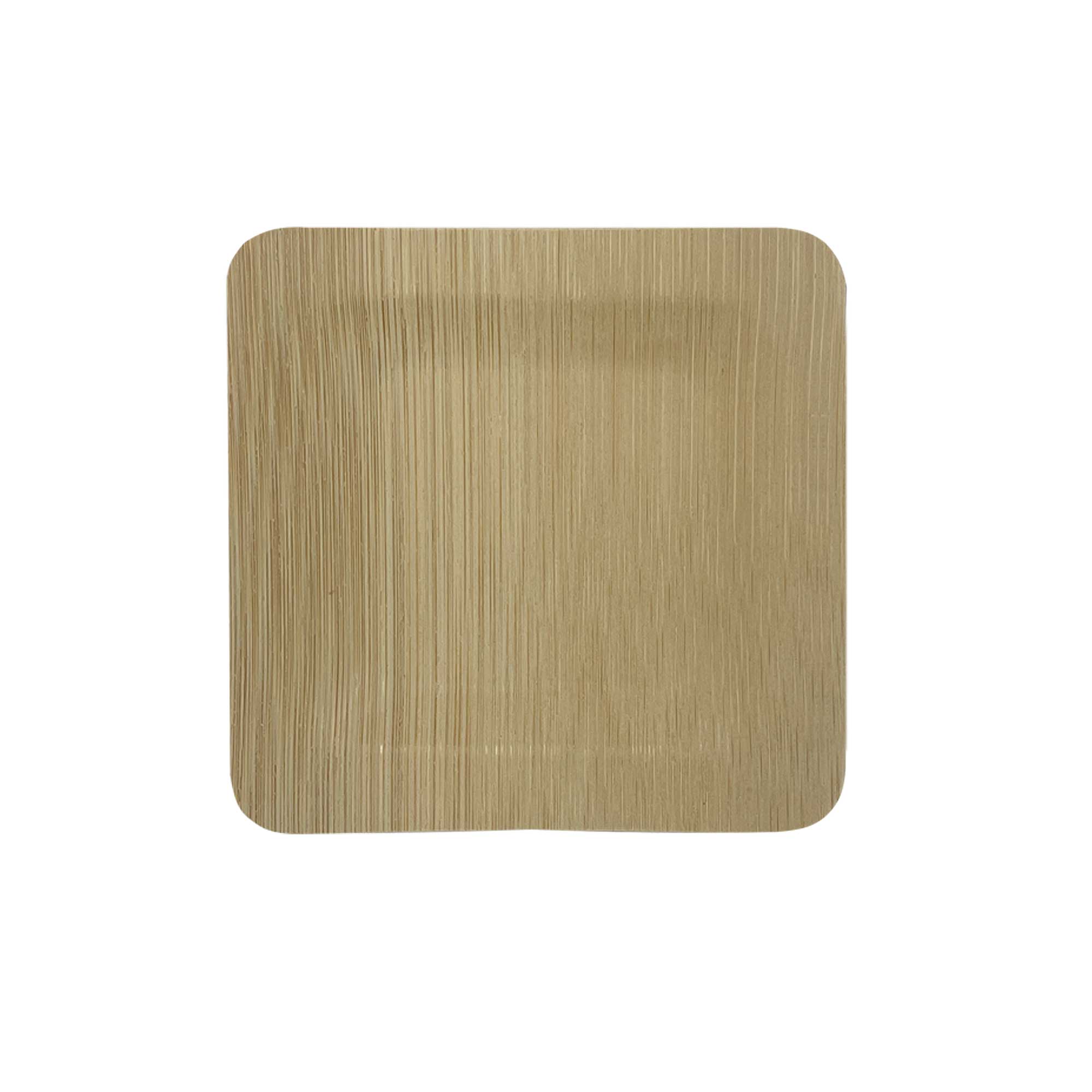 Each piece of 5" Square Bamboo plate is made from the protective covering found on bamboo plants. Harvested, cleaned, boiled, laminated to the desired thickness, and pressed into shape.
