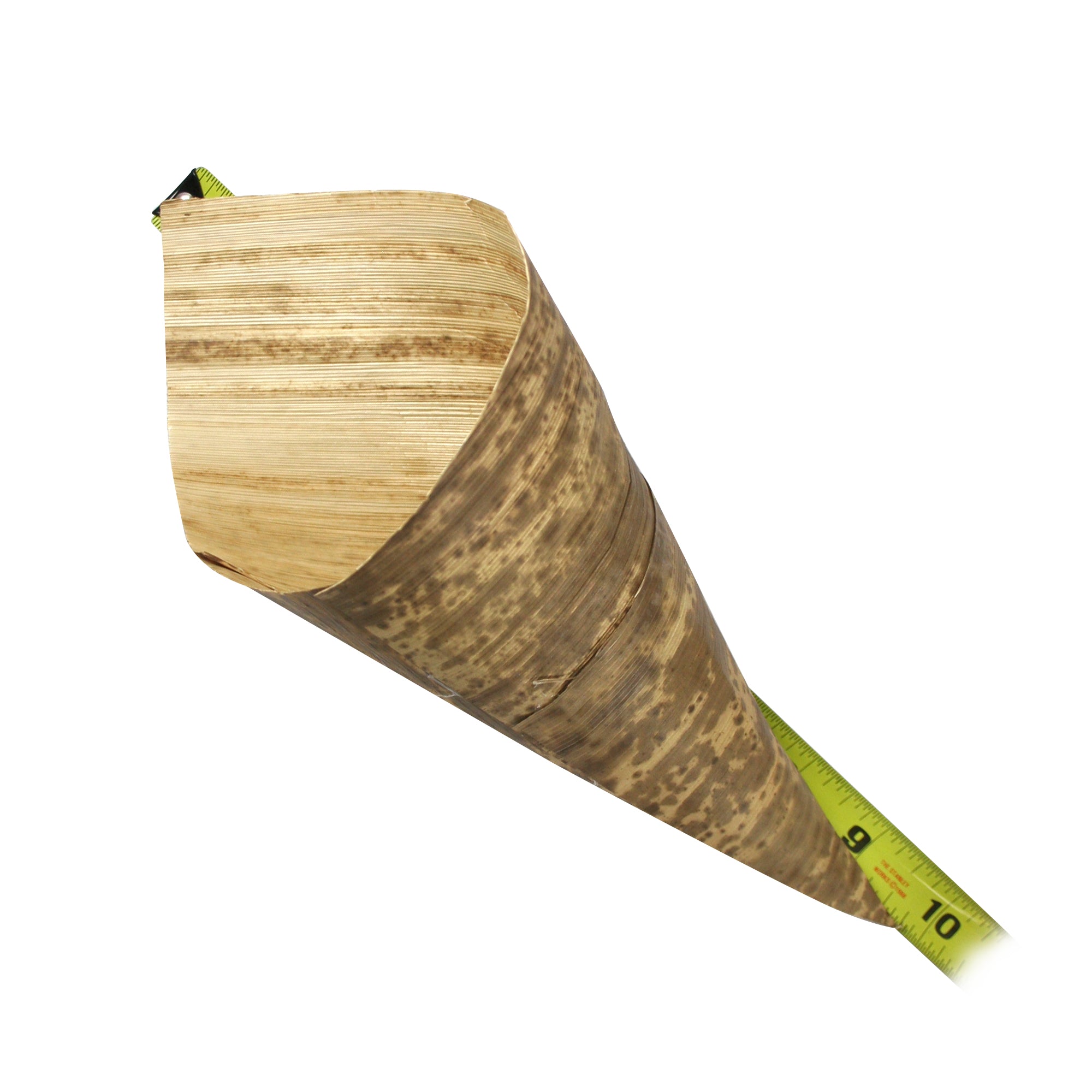 These serving cones are great for catering and parties. Hold it elegantly with your hand and enjoy your fruits, desserts, and many more. Each piece of Bamboo Studio's sheath dinnerware is made from the protective covering found on newly emerging bamboo plants, crafted only from the sheath. Harvested, cleaned, boiled, laminated to the desired thickness, and pressed into shape.