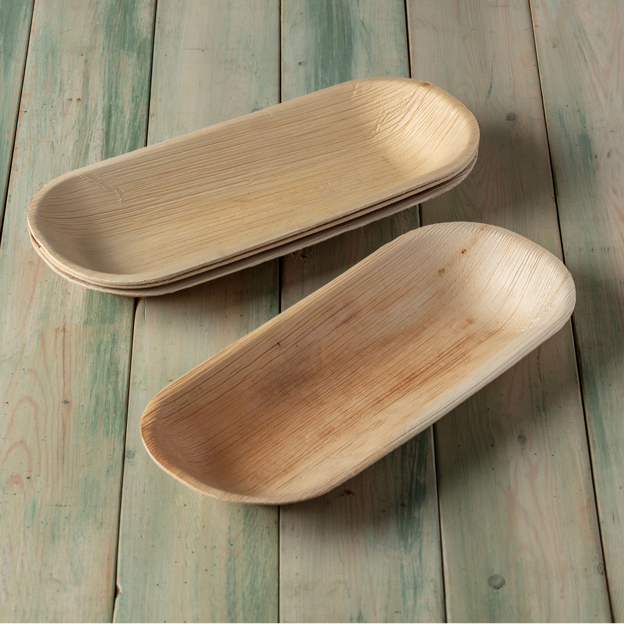 Handcrafted from fallen palm leaves, our dinnerware embodies the beauty of mother nature gifts. Each leaf is thoroughly cleaned, heat pressed, and fully sterilized; the result is sturdy, casually elegant dinnerware ready for everyday dining and relaxed gatherings. This 12"x5" oblong tray is perfect for serving sandwiches and sides.