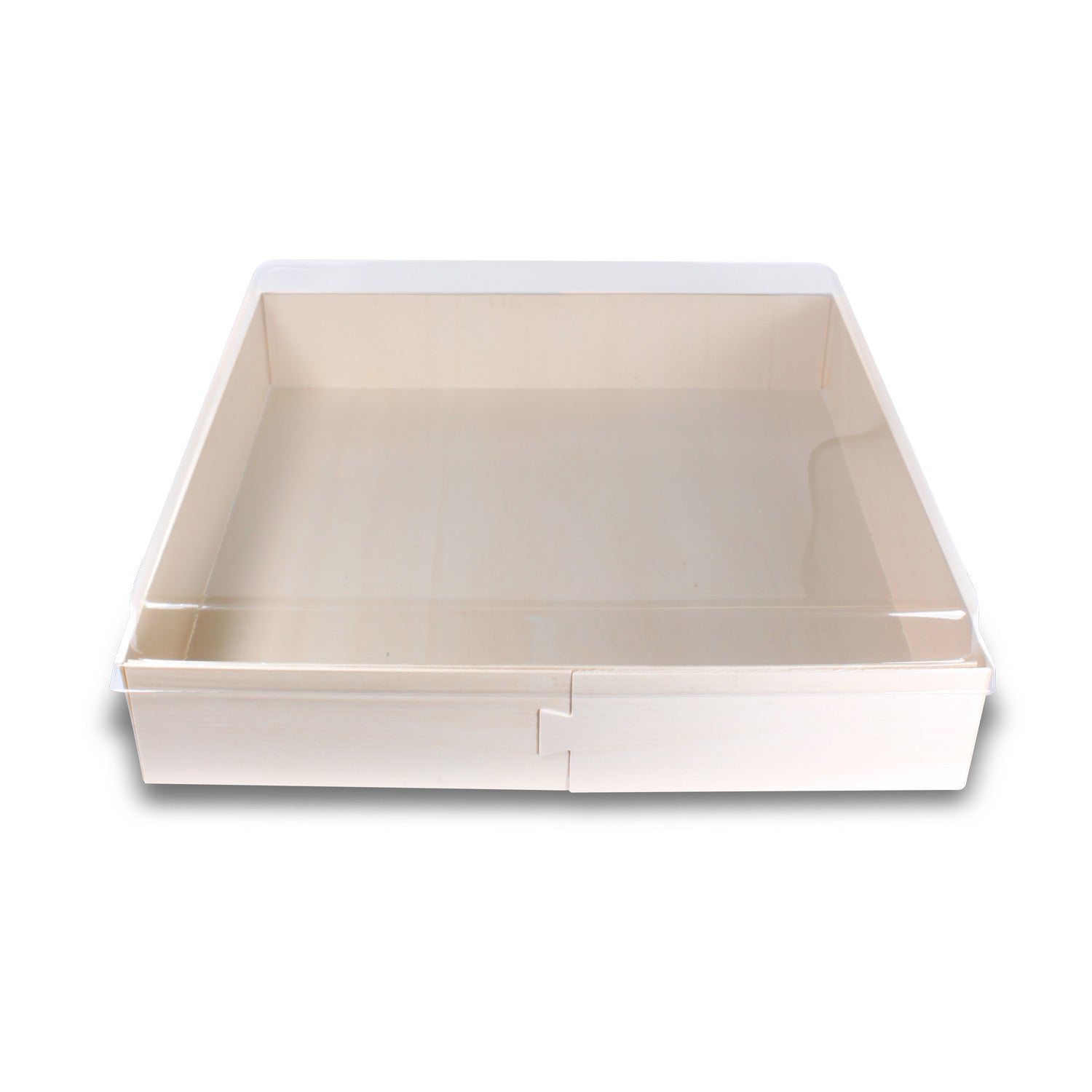 Natural wood with a smooth finish and convenient to use recyclable plastic lids to cover and protect your food. Great for presenting your delectable treats with an earth-friendly twist. Ships folded flat and you have to make it to use it.